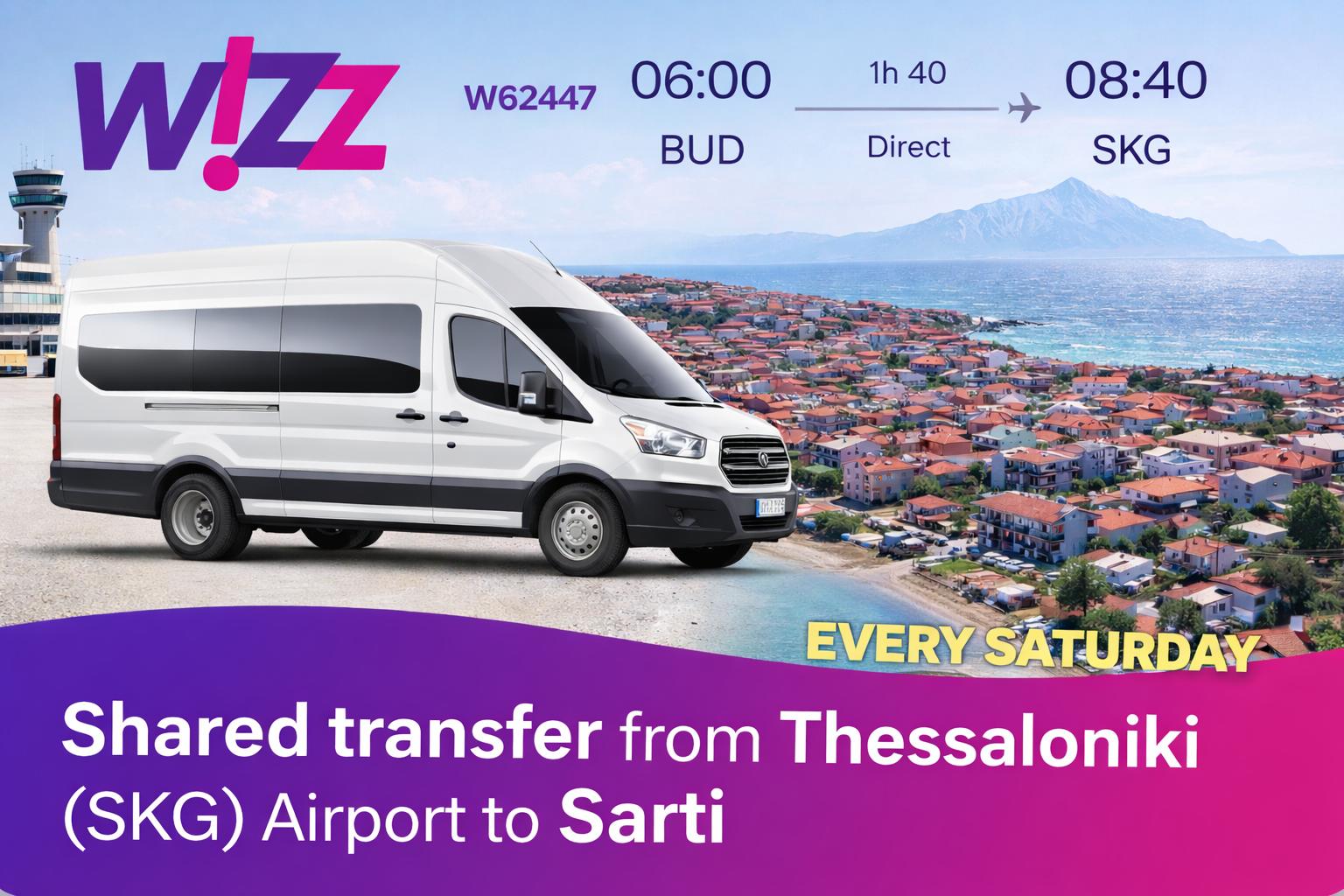 We offer shared transfer services for the Wizz Air flight W62447 from Budapest to Thessaloniki, ensuring a smooth journey from the airport to Sarti (Sithon Travel Agency - Main Parking).