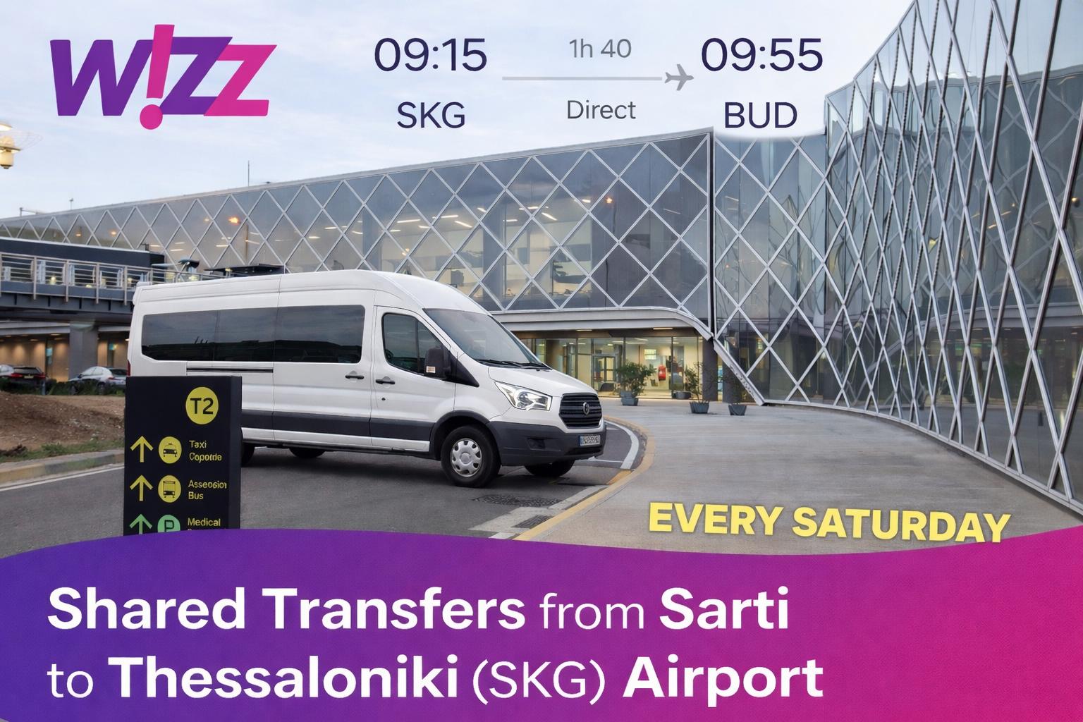 We offer shared transfer services for the Wizz Air flight W62448 from Thessaloniki to Budapest, ensuring a smooth journey from Sarti (Sithon Travel Agency - Main Parking) to the airport Thessaloniki (SKG)