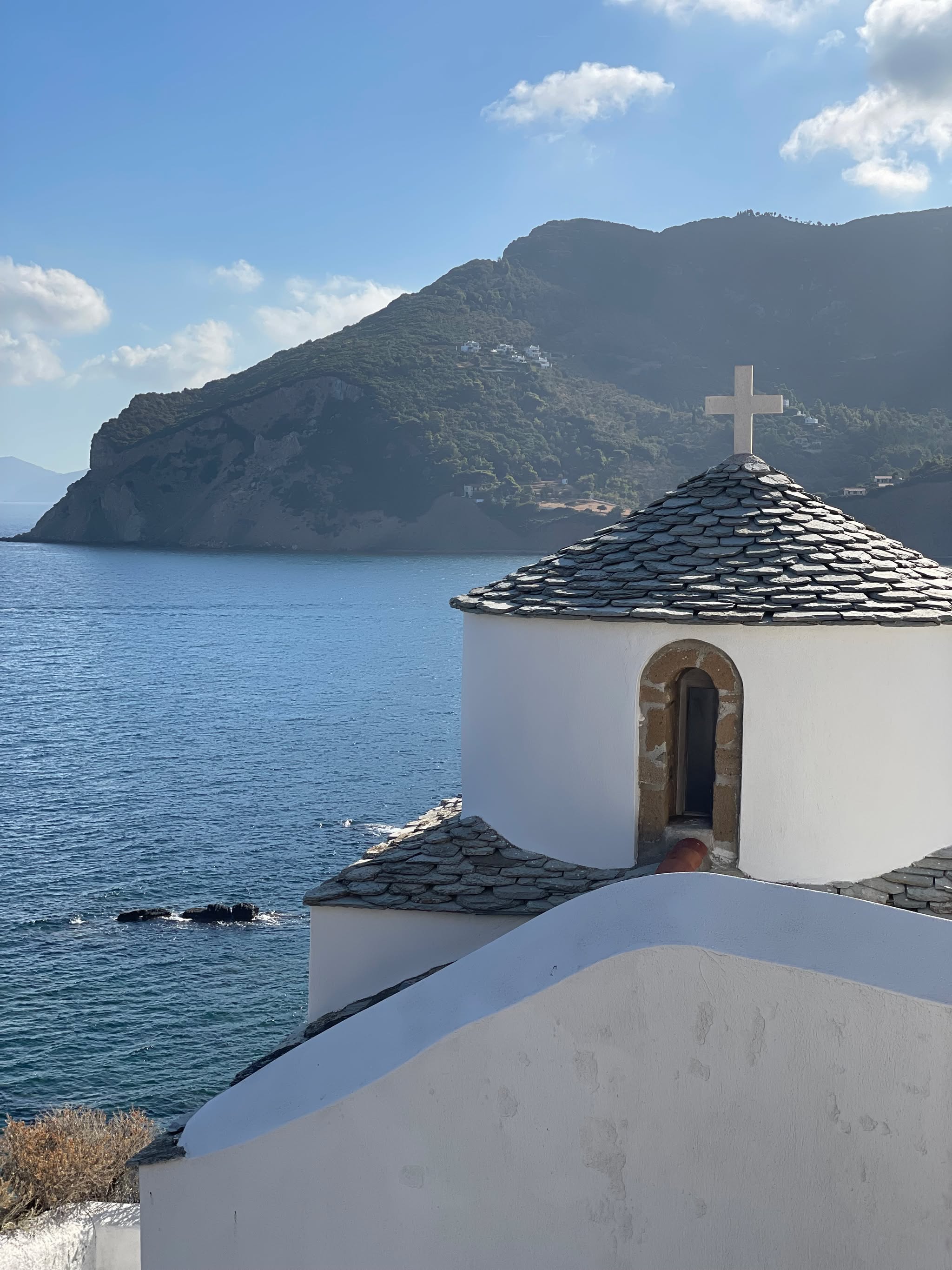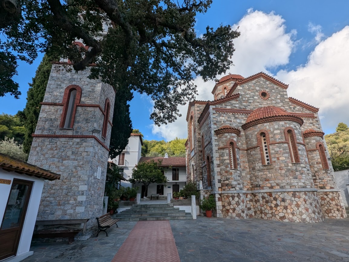 A historic monastery set on the green slopes of Mount Palouki, offering stunning panoramic views over Skopelos Town and the Aegean Sea. Visitors are warmly welcomed by the monastery’s caretaker and can explore the small church, light a candle, and admire handmade religious artifacts crafted on site. Surrounded by pine forest, the monastery combines tranquility, tradition, and beautiful nature. Free outdoor parking available.